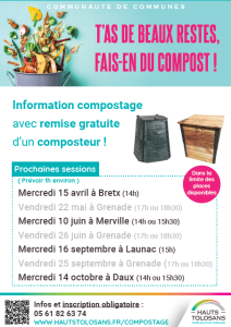 ▶Infos et inscription obligatoire : Service de gestion des déchets de la Communauté de communes 05 61 82 63 74 ou sur www.hautstolosans.fr/compostage